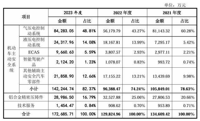 气压电控制动系统,恰恰是瑞立科密收入的主要组成部分。该项业务2021年至2023年的收入分别为8.11亿元、5.62亿元和8.43亿元,60.28%、43.27%和48.81%的收入占比,近乎占据了瑞立科密总收入的半壁江山。