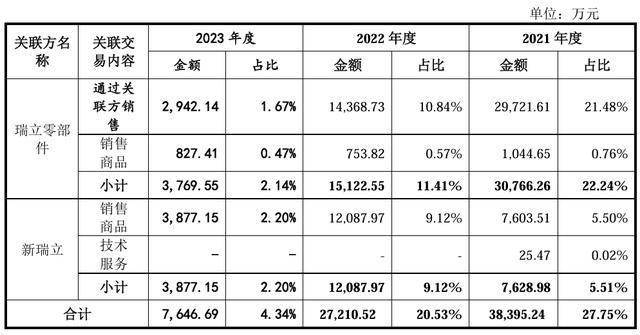 但在资产重组完成后的第一年,瑞立科密的重大关联销售虽然较2021年的27.75%降低7.22%,但占比仍高达20.53%;重大关联采购及接受劳务占比为11.06%,也仅较2021年的11.22%缩减0.16个百分点,直到2023年才出现明显降低。