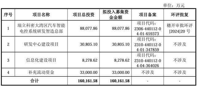 本次冲刺IPO,瑞立科密计划募资16.02亿元,其中8.81亿元将用于瑞立科密大湾区汽车智能电控系统研发智造总部,3.08亿元用于研发中心建设项目,8278.62万元用于信息化建设项目,3.3亿元用于补充流动资金。