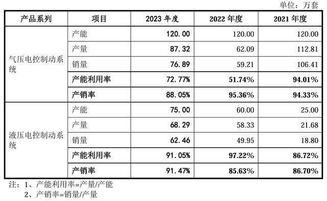 但实际上,瑞立科密的产能利用率降幅十分明显,其中气压电控制动系统的产能利用率已由2021年的94.01%降至2023年的72.77%,而2020年一度处于满产状态;2023年的产销率也较销量不振的2022年下滑7.31个百分点,来到88.05%。