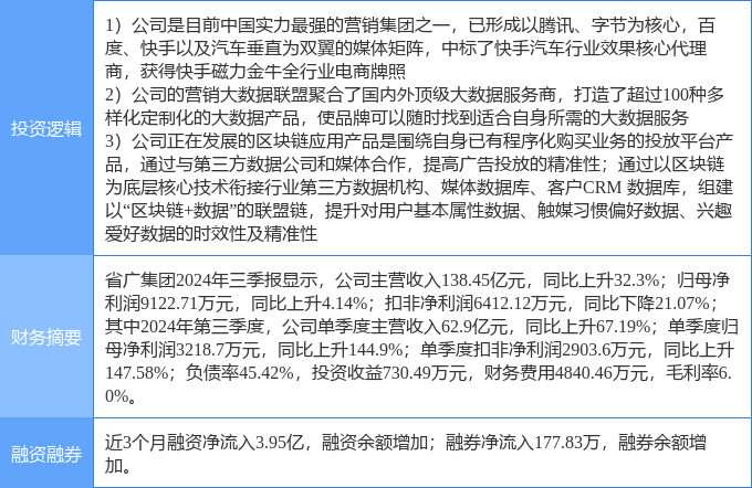 证券之星消息,省广集团11月29日涨停收盘,收盘价8.56元。该股于9点39分涨停,3次打开涨停,截止收盘封单资金为1.5亿元,占其流通市值1.01%。