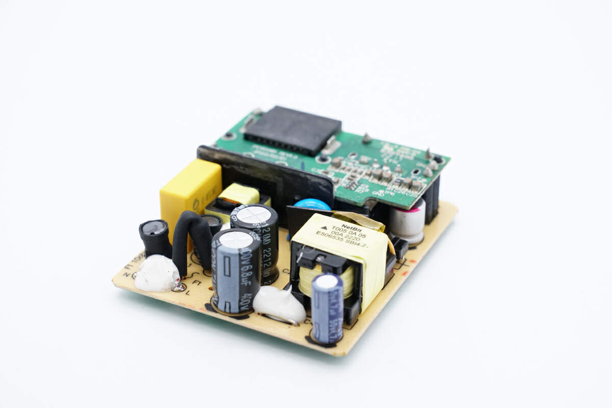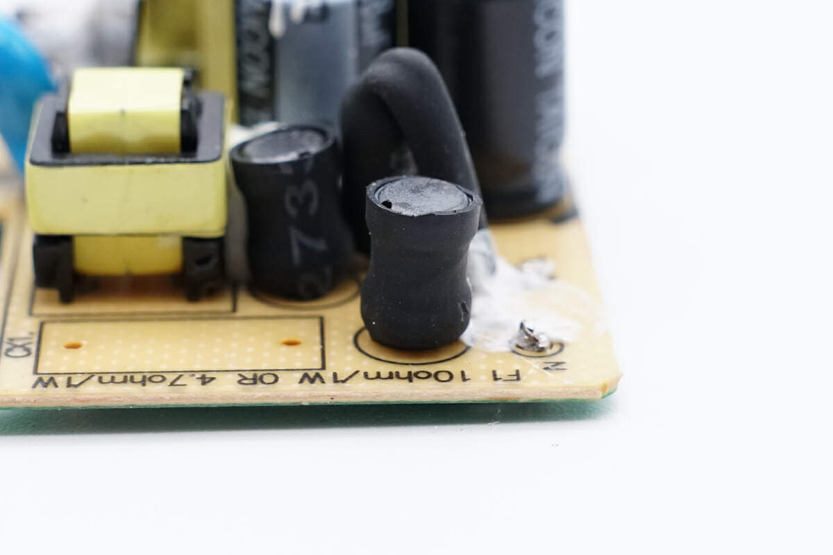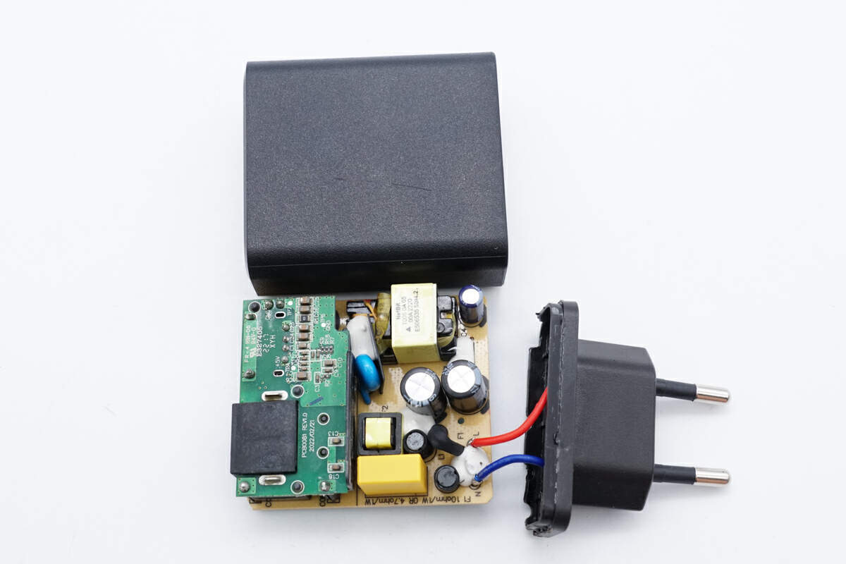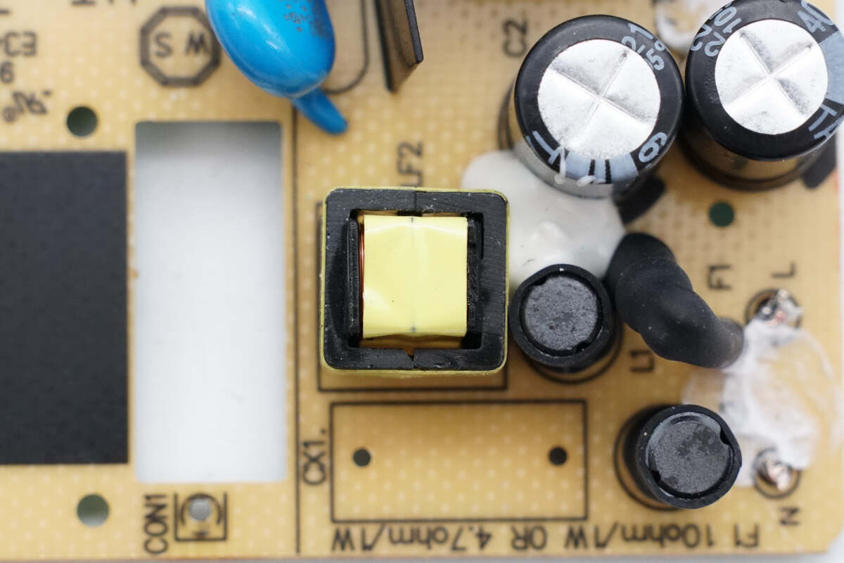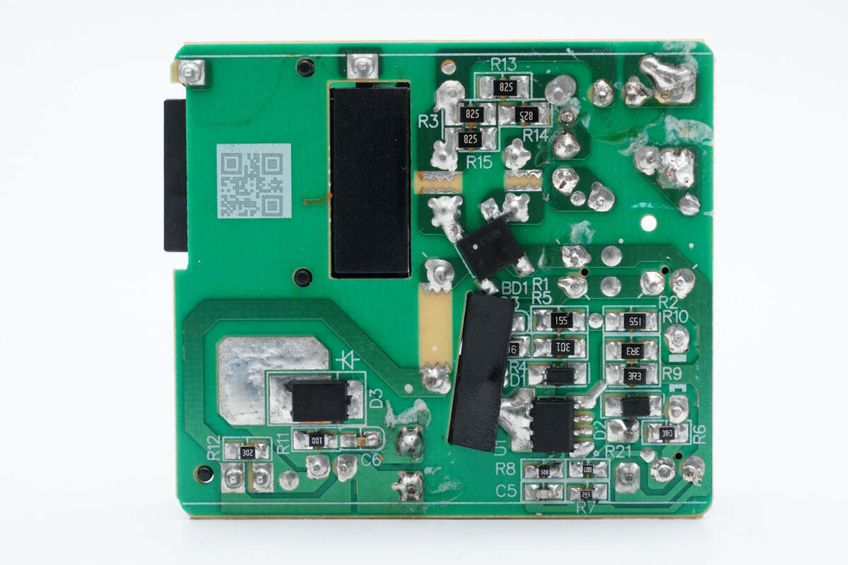 输入端一览,设有保险丝、安规X电容、工字电感、高压滤波电解电容、主控芯片供电电容、变压器等器件,初次级间设有隔离板。