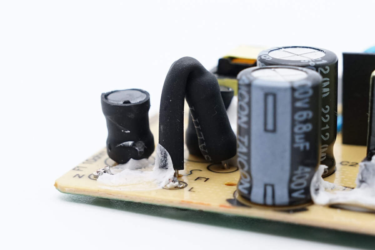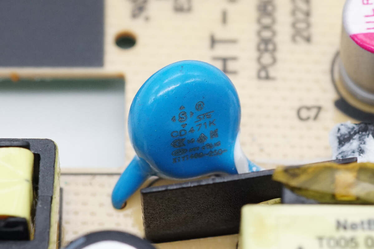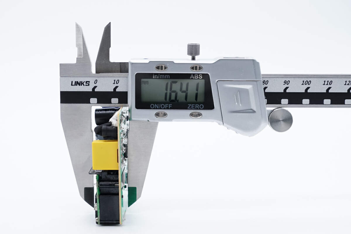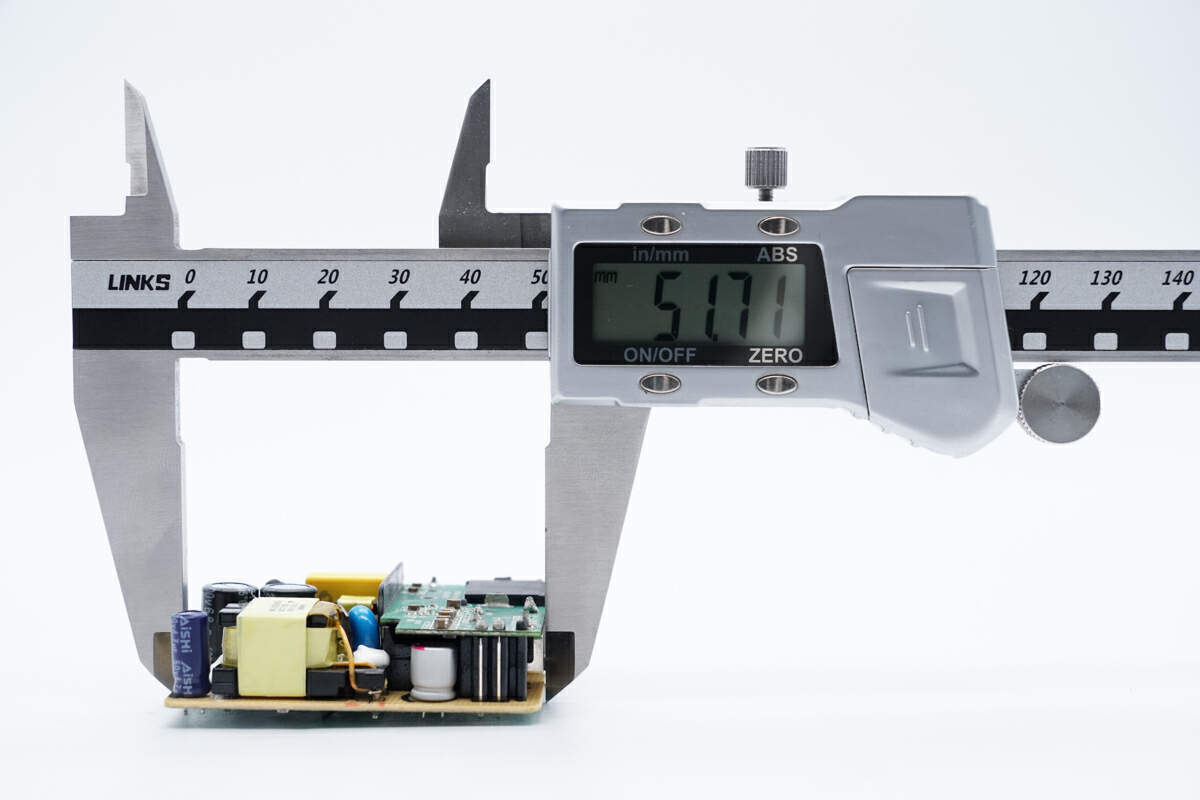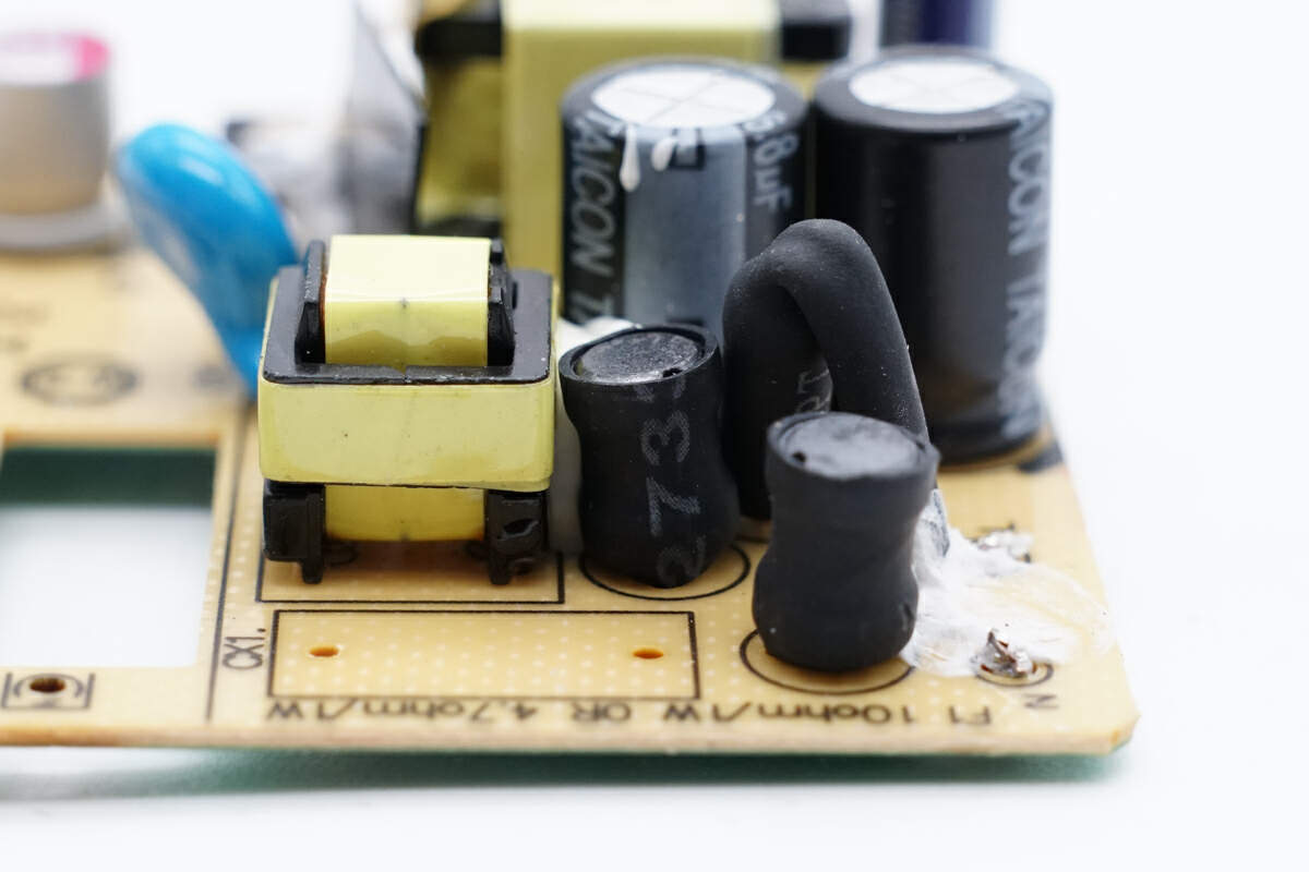 输入端一览,设有保险丝、安规X电容、工字电感、高压滤波电解电容、主控芯片供电电容、变压器等器件,初次级间设有隔离板。