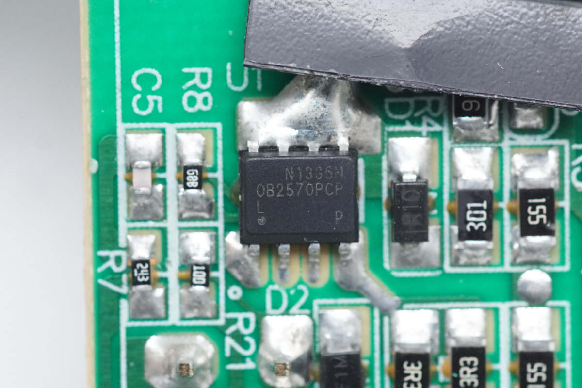开关电源主控芯片来自昂宝,型号OB2570,这是一款出色的初级侧调节控制器,具有CC/CV操作,适用于中等功率AC/DC充电器和适配器应用。其内部集成初级开关MOSFET,并在QR模式下运行,以提供高效率和多种内置保护功能。OB2570采用SOP8封装。