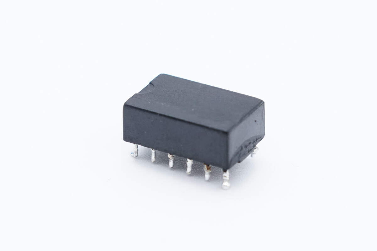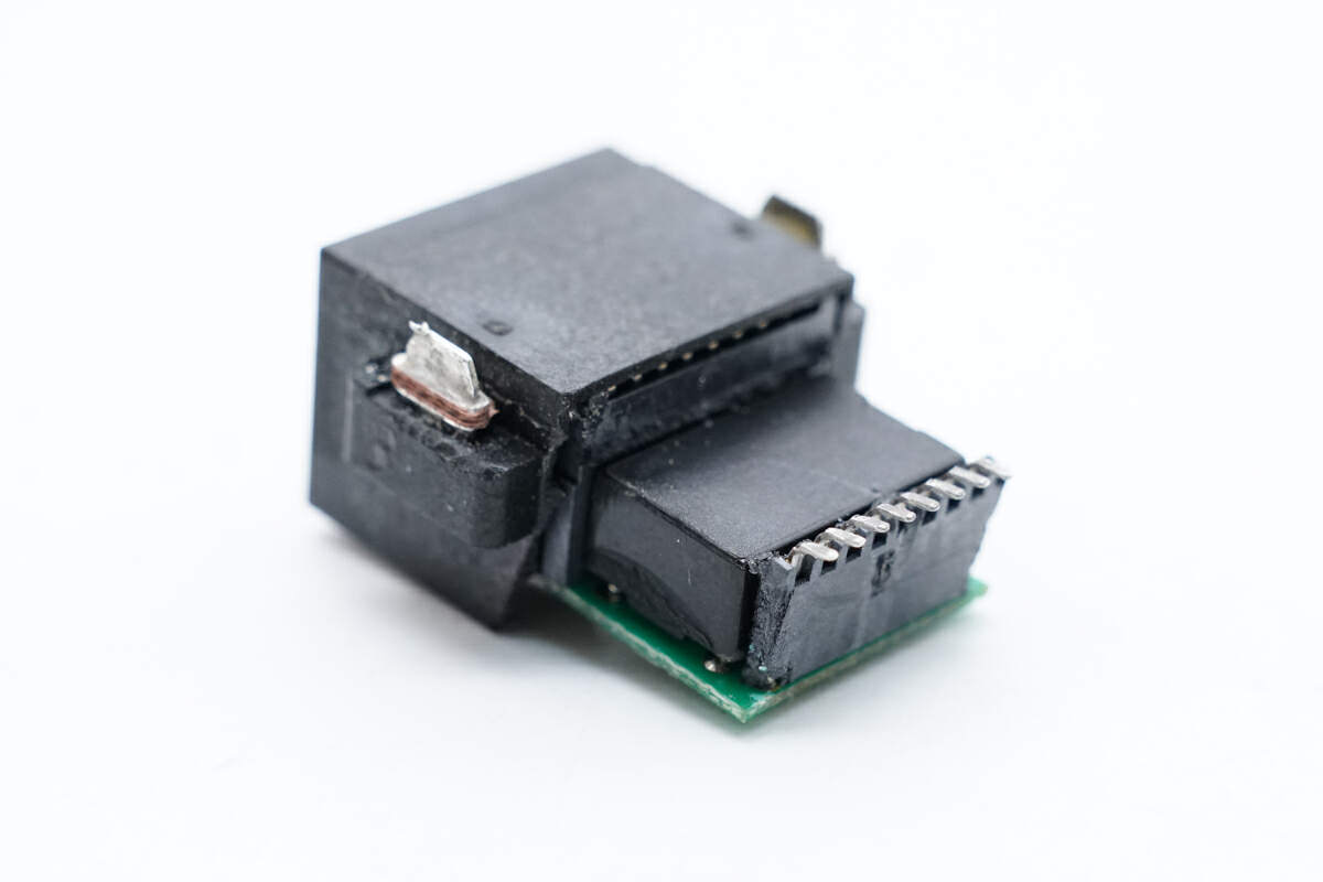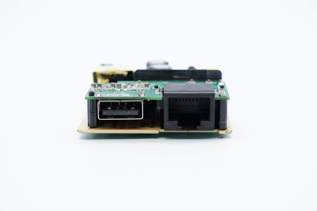 PCBA模块由两块小板组成,之间通过排针连接支撑,顶部小板对应网口模块处镂空降低厚度。主板正面工字电感、电容、变压器等器件打胶加固,此外设有麦拉片进行初次级隔离。