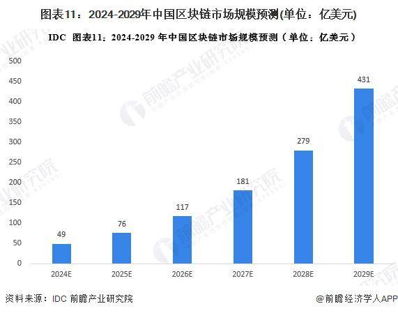 短期来看,区块链作为我国 " 十四五 " 规划数字经济重点产业之一,国家层面对于产业发展的支持态度不会改变,区块链技术与经济社会各领域深度融合的良好态势不会改变,因此产业各方应保持战略定力,稳步推进区块链技术应用创新。中期来看,随着 " 数据二十条 " 等一系列政策措施相继出台和数据基础设施建设的快速推进,区块链技术能够有力支撑数据权利分置导向,推动数据要素可靠、可信、安全流转,有望在数据确权、交易、流通等场景中发挥重要价值。长期来看,Web3.0、元宇宙等新兴产业正快速发展,区块链作为其关键底层支撑技术,随着网络规模不断扩展、技术渗透率持续强化、应用成熟度稳步提升,有望为 Web3.0、元宇宙等新理念提供先行先试的创新载体,探索形成可体验、可感知的新模式、新业态。根据 IDC 披露的数据,中国区块链市场规模未来年均复合增长率 ( CAGR ) 将达到 54.6%,由此测算到 2029 年中国区块链市场规模将达到 431 亿美元。