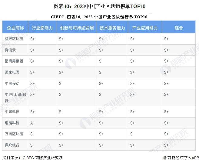 2023 年 10 月,"2023 中国产业区块链企业 100 强 " 正式发布,榜单基于调研企业 2022 年度全年相关数据统计分析与核查比对得出,由行业影响力、创新与可持续发展、技术服务能力、产业应用能力四个一级指标,企业营收规模、区块链搜索指数、央媒报道、区块链产值占比等 19 个细化统计指标构成。"2023 中国产业区块链企业 100 强 " 名单中,蚂蚁区块链、腾讯云、招商局集团、国家电网、中国移动、中国工商银行、中国电信、趣链科技等企业位居前列。