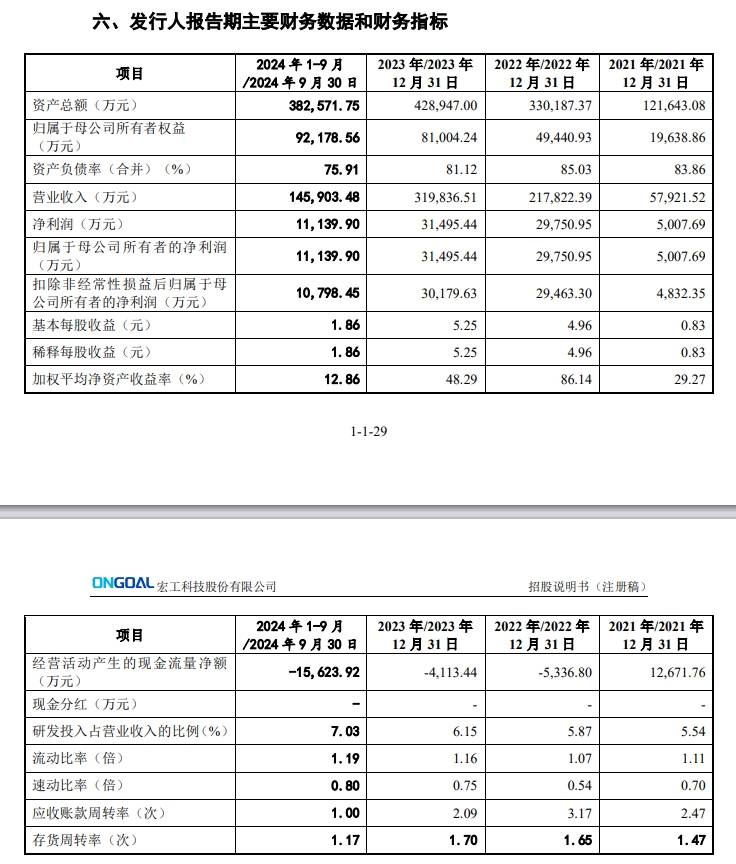 业绩方面,2021年至2024年前三季度,宏工科技营业收入分别为5.79亿元、21.78亿元、31.98亿元、14.59亿元,归母净利润分别为5007.69万元、2.98亿元、3.15亿元、1.11亿元。