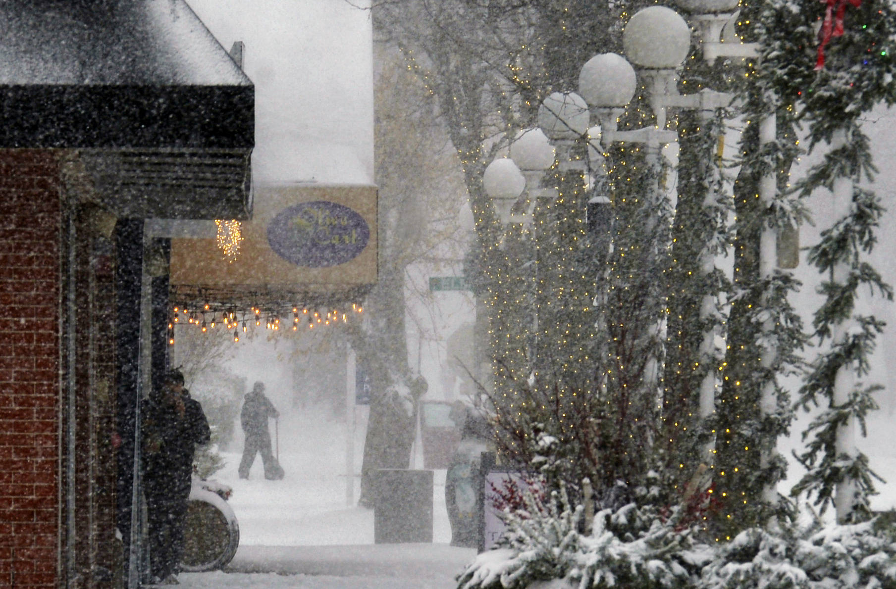 12月2日,在美国密歇根州圣约瑟夫,人们冒雪购物。新华社发