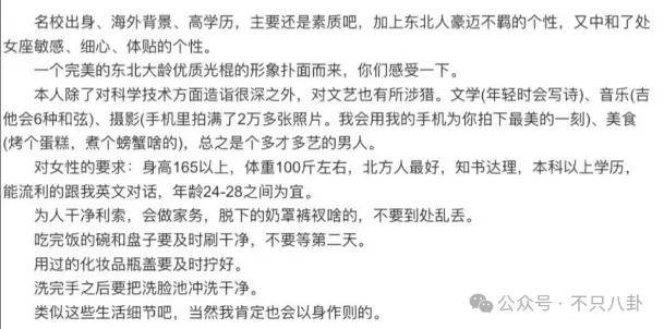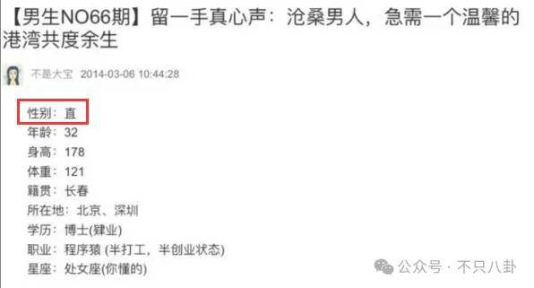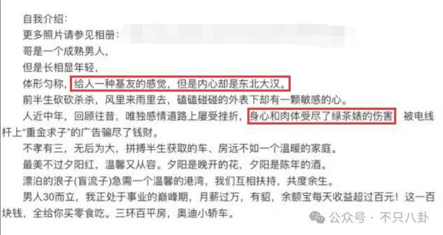 早年他在豆瓣征婚,名句是《把我伺候好,是女人最大的幸福》,爹味直男癌溢出屏幕,看起来非常支棱。