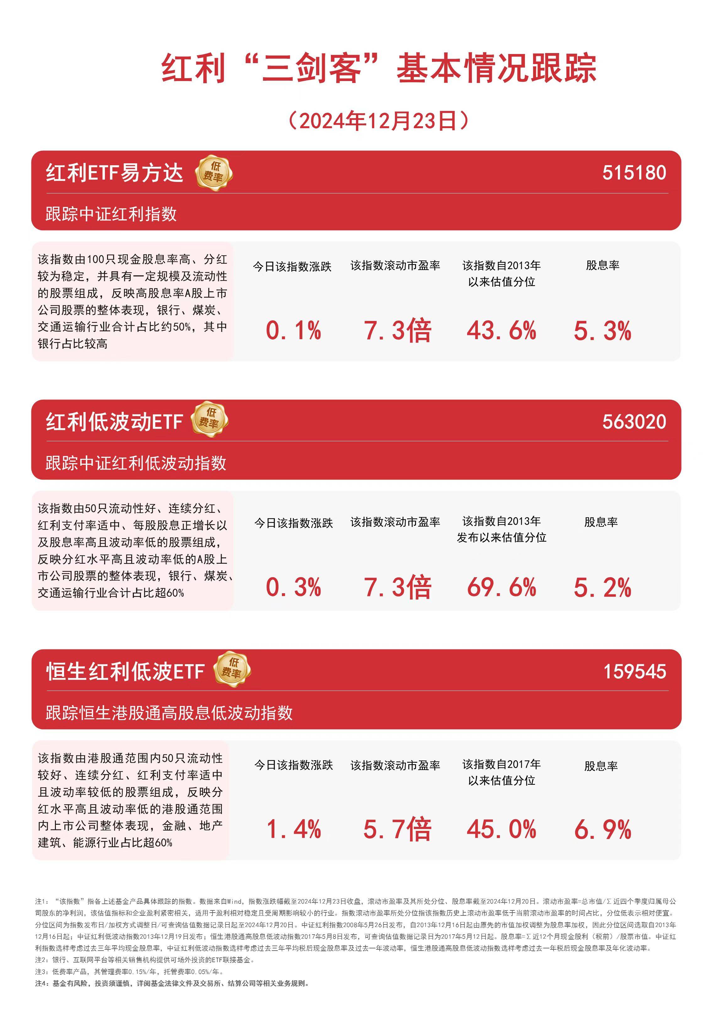 截至收盘,今日中证红利指数上涨0.1%,中证红利低波动指数上涨0.3%,恒生港股通高股息低波动指数上涨1.4%。