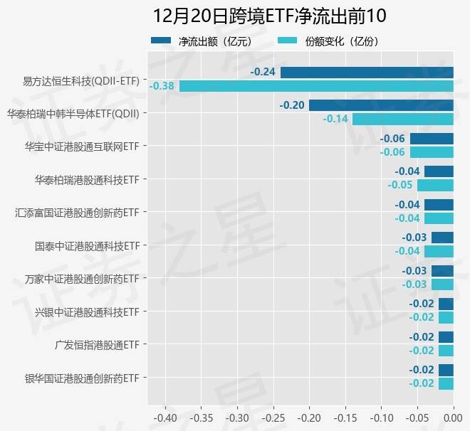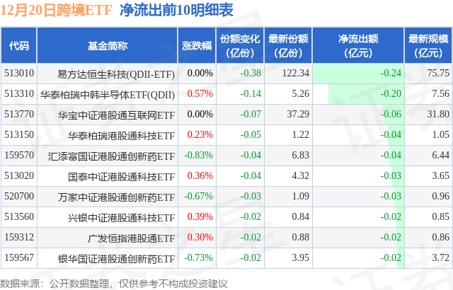 当日有14只跨境ETF基金出现资金净流出,其中净流出排首位的是易方达恒生科技(QDII-ETF)(513010),份额减少了3800.0万份,净流出额为2390.2万元。