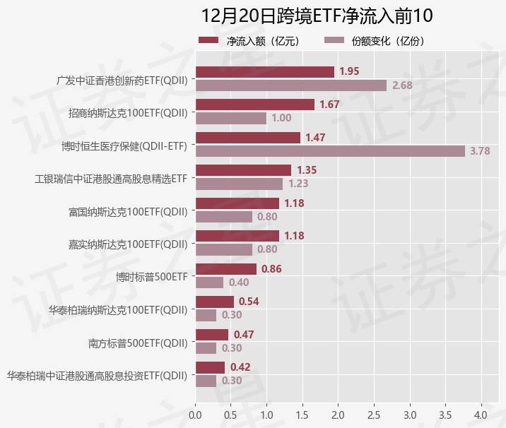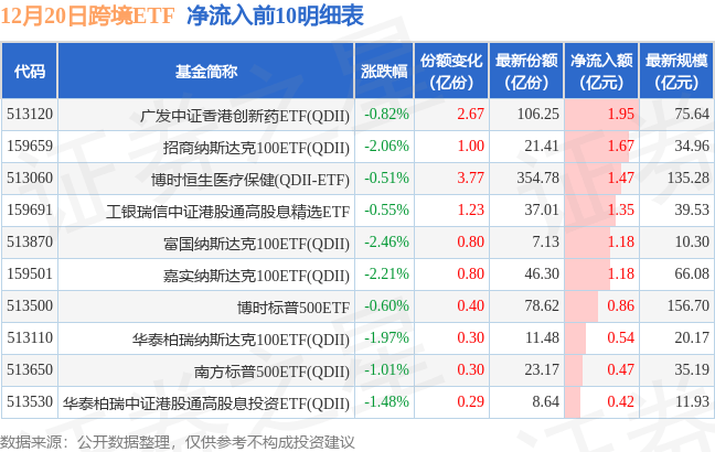 当日有62只跨境ETF基金出现资金净流入,其中净流入排首位的是广发中证香港创新药ETF(QDII)(513120),份额增加了2.67亿份,净流入额为1.95亿元。
