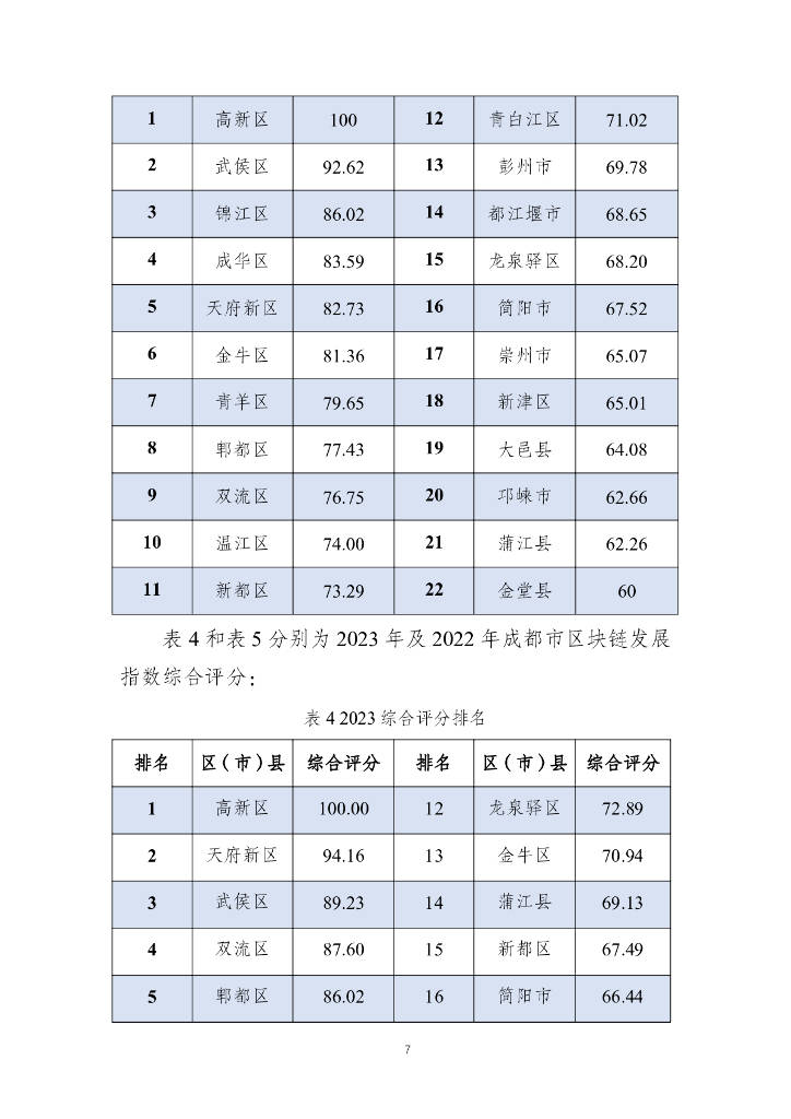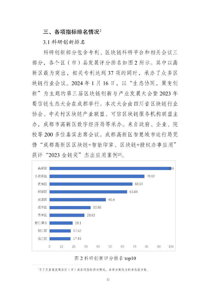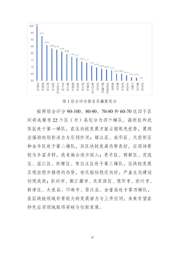 《报告》从科研创新、产业发展、应用落地和发展环境四个维度出发,构建了包含专利、区块链科研平台、备案企业等 18 项三级指标的评价体系,对成都市 22 个区(市)县的区块链产业进行全面评估和分析,并对未来发展提出建议。