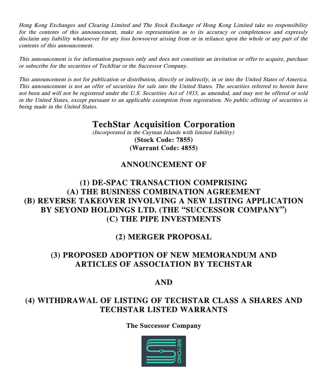 2024年12月20日,港股特殊目的收购公司TechStar Acquisition Corporation在港交所发布公告称,已与BAI资本成员企业Seyond Holdings Ltd.(图达通)签订业务合并协议,标志着Seyond图达通计划通过De-SPAC的方式在港上市。本次De-SPAC交易的议定估值为117亿港元,约合人民币110亿元。