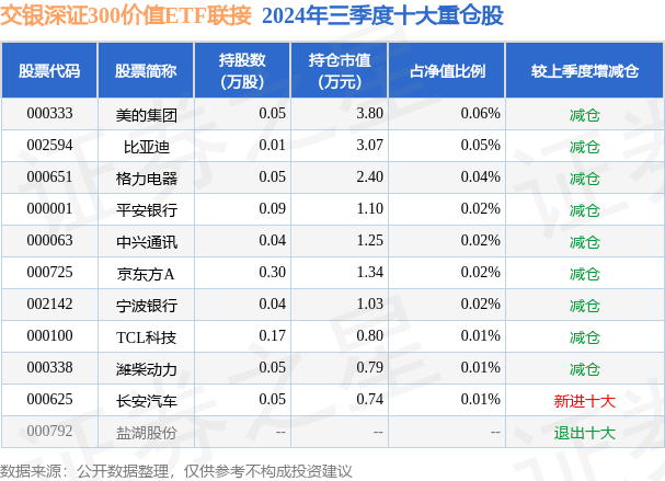 交银深证300价值ETF联接为指数型-股票基金,根据最新一期基金季报显示,该基金资产配置:股票占净值比0.6%,无债券类资产,现金占净值比6.49%。基金十大重仓股如下:
