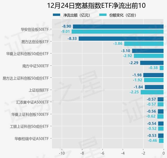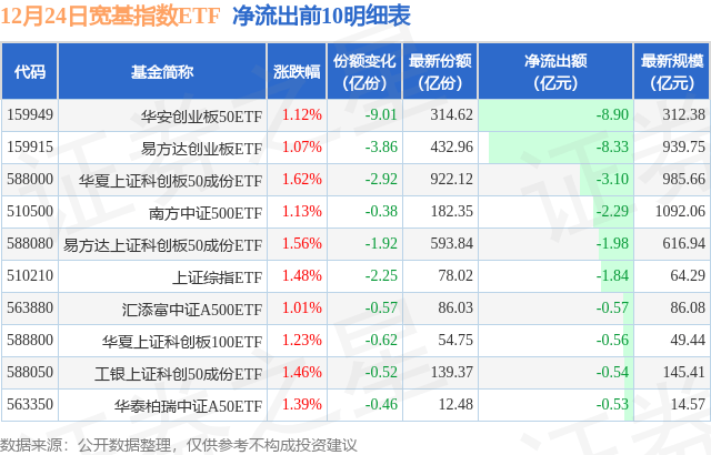 当日有74只宽基指数ETF基金出现资金净流出,其中净流出排首位的是华安创业板50ETF(159949),份额减少了9.01亿份,净流出额为8.9亿元。