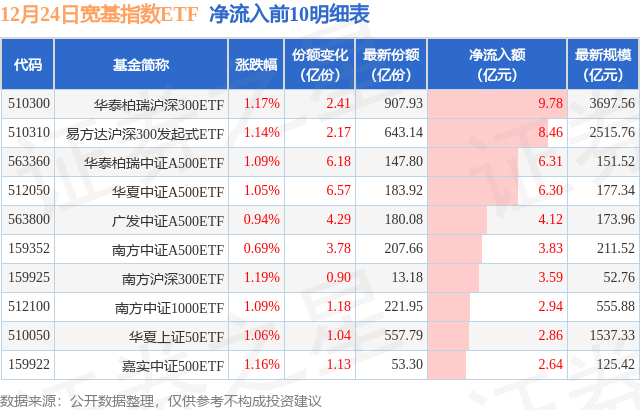 当日有56只宽基指数ETF基金出现资金净流入,其中净流入排首位的是华泰柏瑞沪深300ETF(510300),份额增加了2.41亿份,净流入额为9.78亿元。