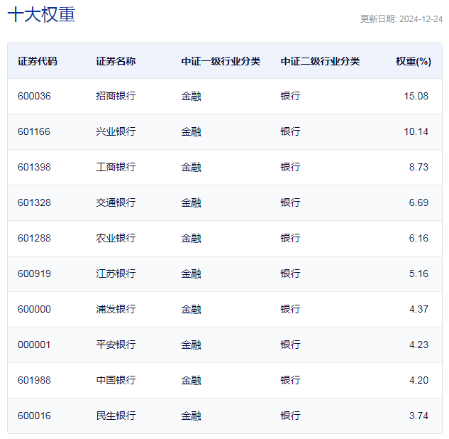 中证银行指数(399986.SZ)发布于2013年7月15日,为反映中证全指指数样本中银行行业公司证券的整体表现,为投资者提供分析工具。成分股分布于银行业,平均市值较大,持仓集中度较高。