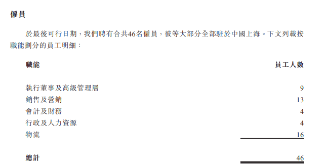 截至招股书披露之时,整个公司仅有46名成员,其中高层管理人员9名,销售团队12人,会计及财务人员4名,行政人员4名,以及负责物流的17名员工。
