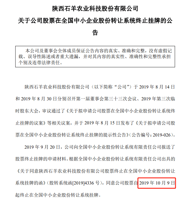 2019年8月,石羊农科公告称,结合公司发展阶段所处的内外部环境因素,提高决策效率和竞争能力,将进一步专注业务拓展和客户服务水平,减少挂牌造成的费用支出等原因,拟申请终止挂牌。2019年10月9日起,石羊农科正式终止挂牌。