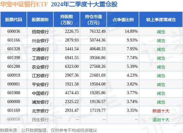 华宝中证银行ETF为指数型-股票基金,根据最新一期基金季报显示,该基金资产配置:股票占净值比98.66%,无债券类资产,现金占净值比2.01%。基金十大重仓股如下:
