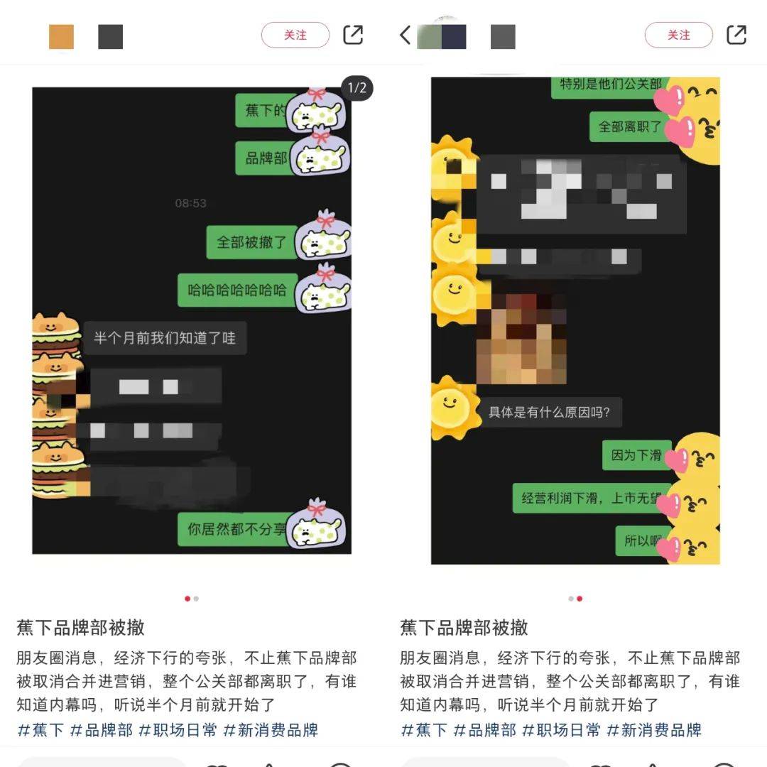 据“界面新闻”报道,这一调整发生在7月上旬,蕉下原品牌部员工数量大约为四五十人。而小红书上也有网友们发帖称,蕉下品牌部被撤。