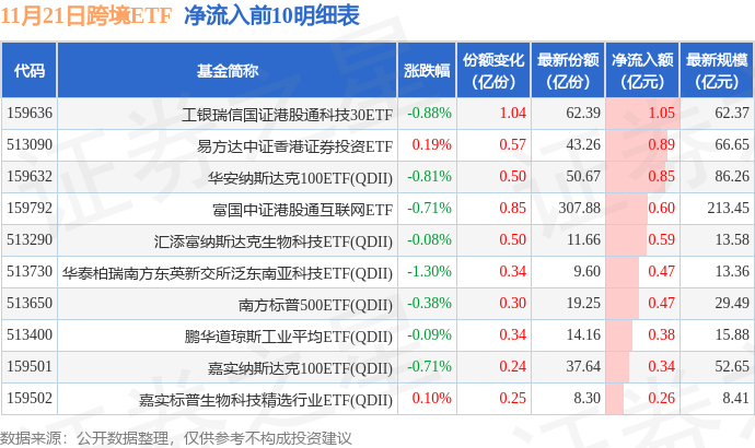 证券之星消息,11月21日跨境ETF基金合计资金净流入5.84亿元,近5个交易日累计净流入32.3亿元,5个交易日中出现日合计资金净流入的有5天(ETF资金流向计算公式:(当日ETF场内流通份额-前一交易日ETF场内流通份额)*当日ETF均价,计算结果仅供参考)。