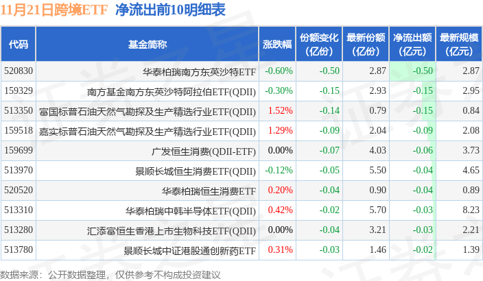 当日有19只跨境ETF基金出现资金净流出,其中净流出排首位的是华泰柏瑞南方东英沙特ETF(520830),份额减少了5000.0万份,净流出额为5000.67万元。