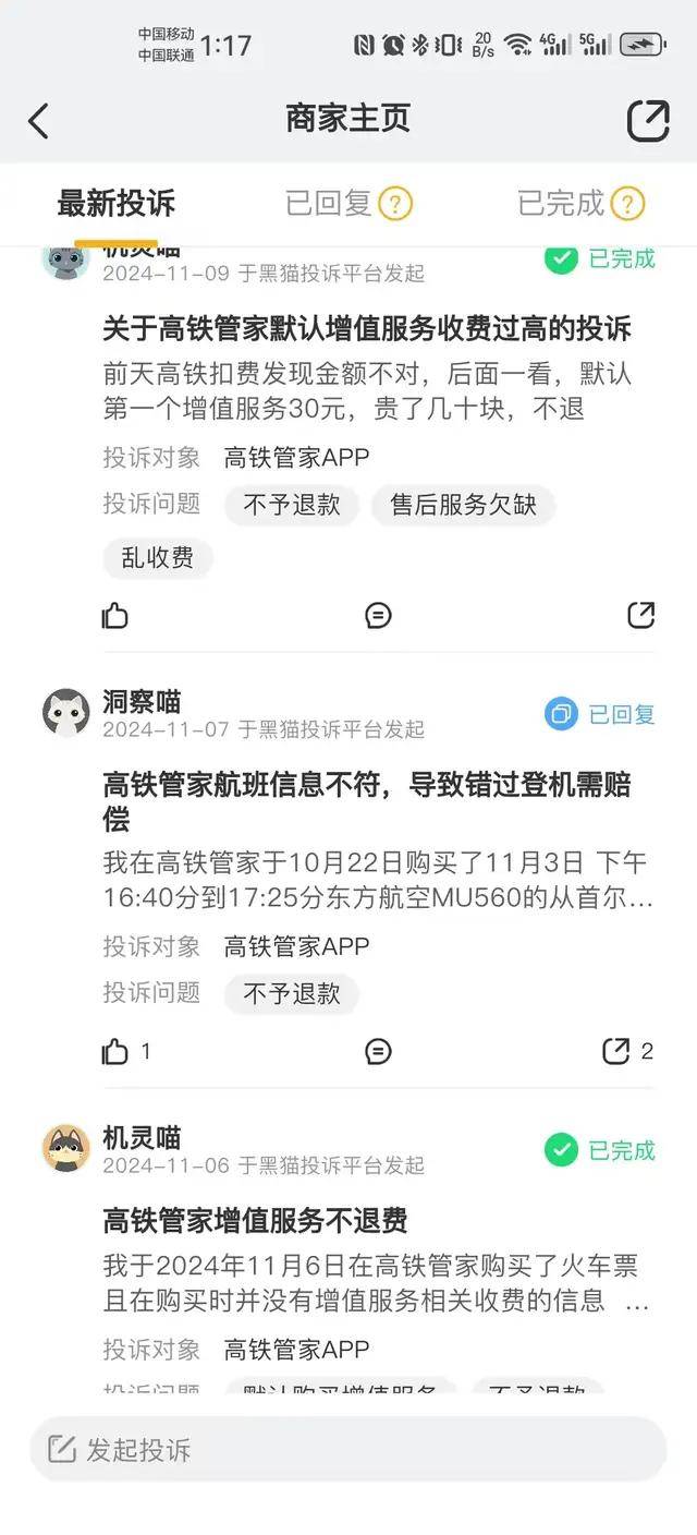 在黑猫投诉平台上,高铁管家APP的投诉数已达5529条,涉及增值服务收费过高、增值服务不退费、要求退还手续费、乱收费等问题;航班管家APP则有177条投诉,涉及强制附加服务和机票退款。