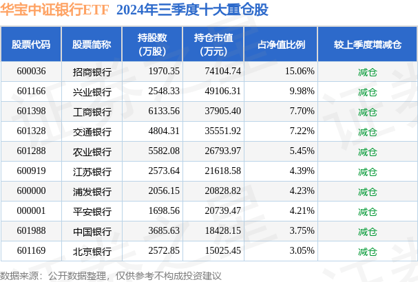 华宝中证银行ETF为指数型-股票基金,根据最新一期基金季报显示,该基金资产配置:股票占净值比98.85%,无债券类资产,现金占净值比1.12%。基金十大重仓股如下: