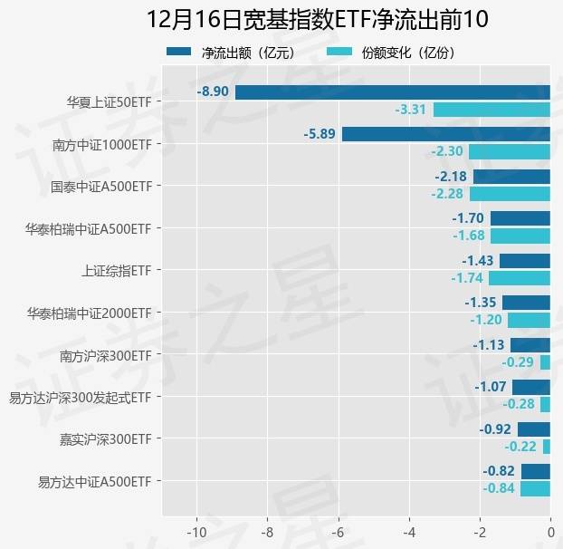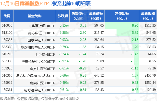 当日有51只宽基指数ETF基金出现资金净流出,其中净流出排首位的是华夏上证50ETF(510050),份额减少了3.31亿份,净流出额为8.9亿元。