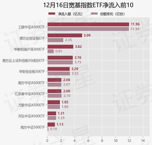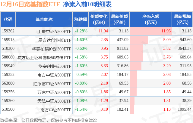 证券之星消息,12月16日宽基指数ETF基金合计资金净流入15.85亿元,近5个交易日累计净流入270.26亿元,5个交易日中出现日合计资金净流入的有4天(ETF资金流向计算公式:(当日ETF场内流通份额-前一交易日ETF场内流通份额)*当日ETF均价,计算结果仅供参考)。