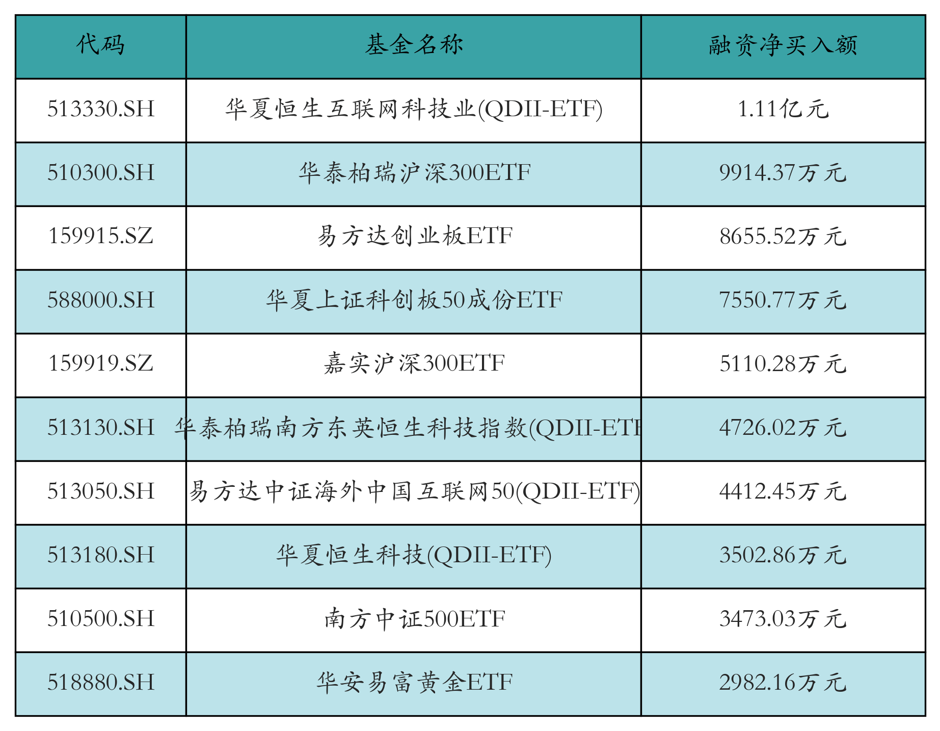 12月16日ETF融资净买入额前三位分别为:华夏恒生互联网科技业(QDII-ETF)(1.11亿元)、华泰柏瑞沪深300ETF(9914.37万元)和易方达创业板ETF(8655.52万元),前10具体见下表: