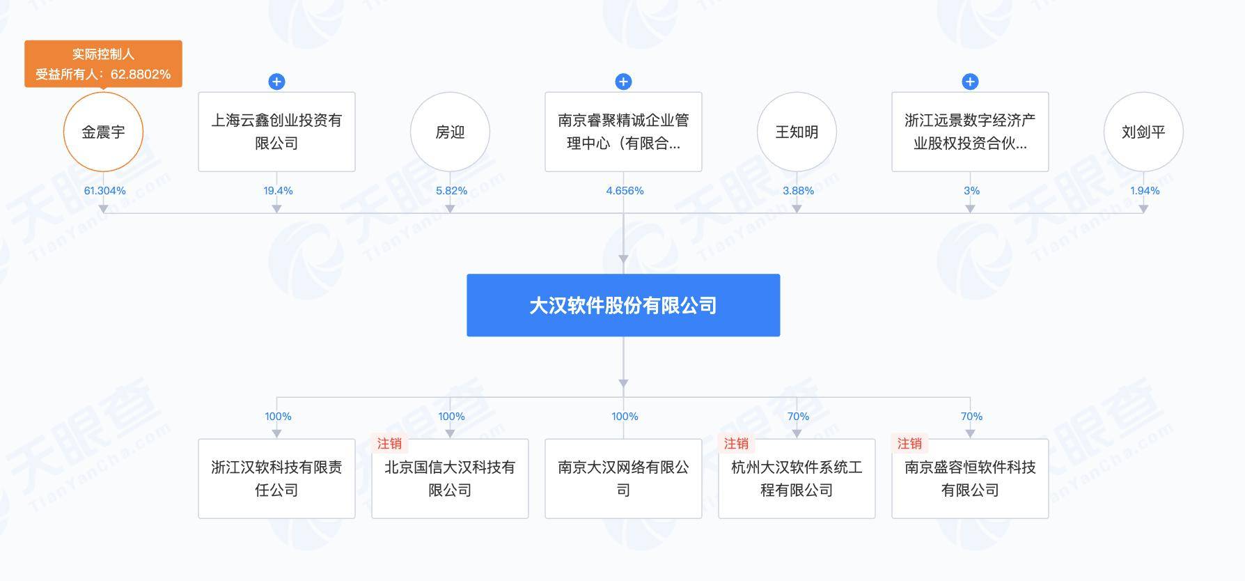 截至招股书签署日,金震宇直接持有大汉软件61.3040%的股份,通过员工持股平台睿聚精诚间接控制该公司4.6560%的股份,合计控制65.96%的股份,为该公司控股股东和实际控制人。当前,金震宇为大汉软件董事长、总经理。
