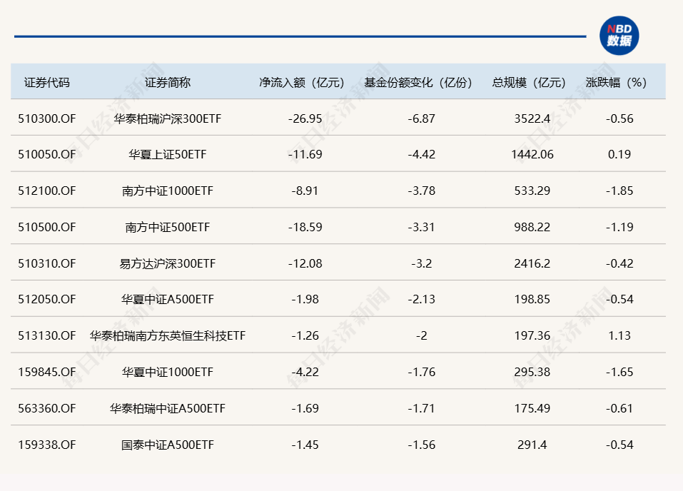 与此同时,华泰柏瑞沪深300ETF基金份额减少6.87亿份,净流出额为26.95亿元;华夏上证50ETF基金份额减少4.42亿份,净流出额为11.69亿元;南方中证1000ETF基金份额减少3.78亿份,净流出额为8.91亿元。