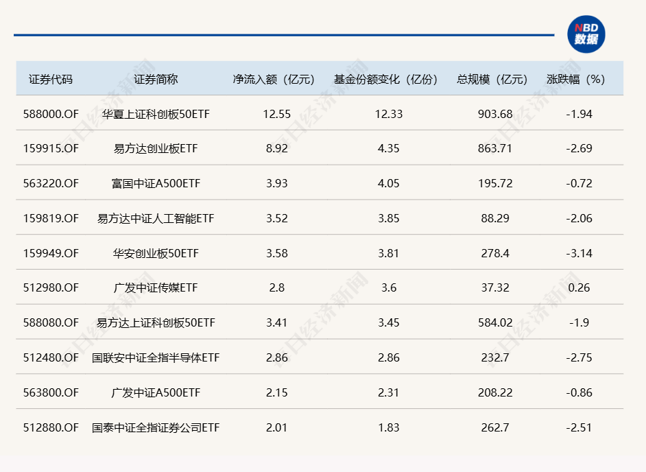 Wind数据显示,在1月27日的非货币ETF市场中,华夏上证科创板50ETF基金份额增加12.33亿份,净流入额为12.55亿元;易方达创业板ETF基金份额增加4.35亿份,净流入额为8.92亿元;富国中证A500ETF基金份额增加4.05亿份,净流入额为3.93亿元。
