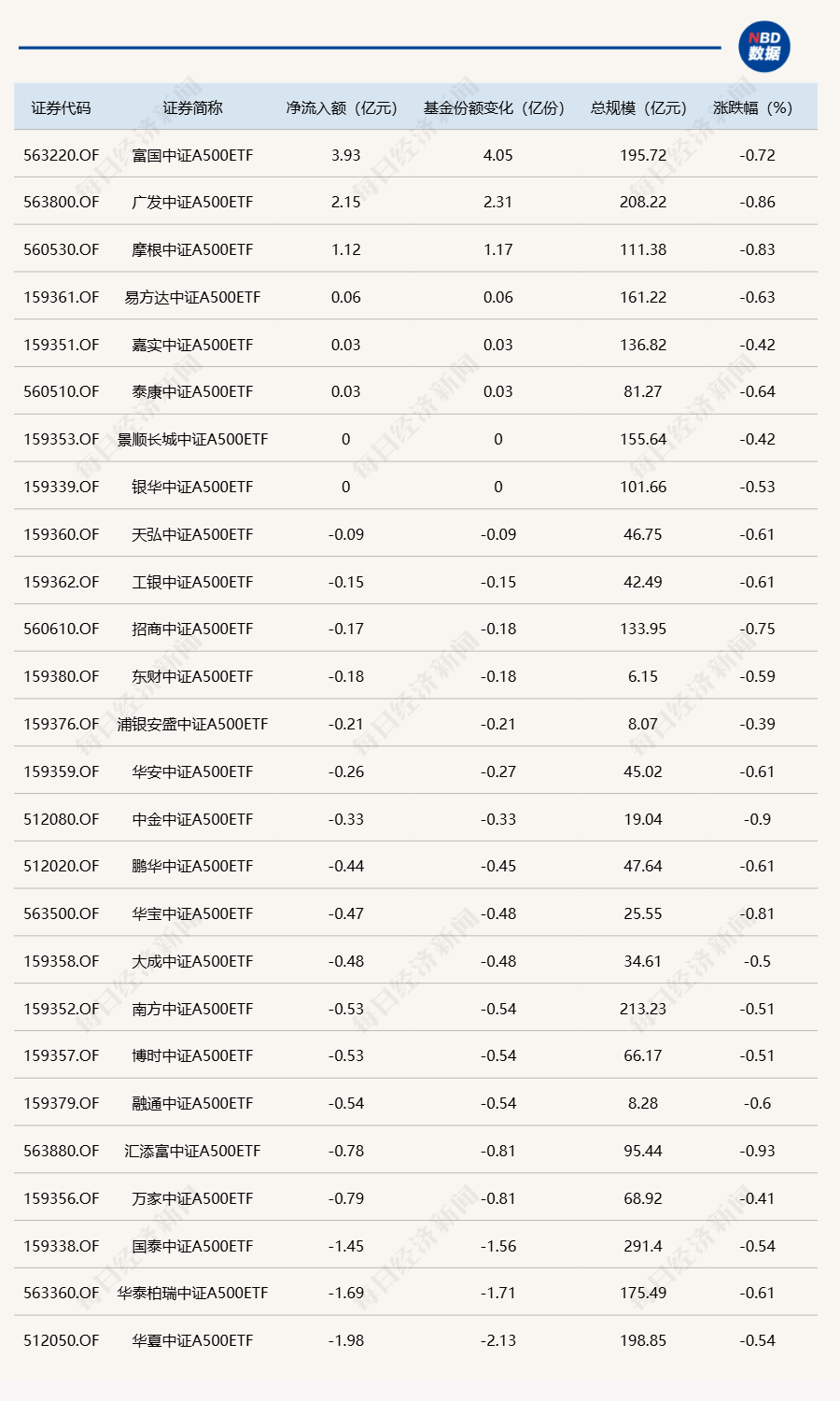 此外,上周五场内26只中证A500ETF合计净流出3.76亿元,其中有6只获得资金增持。