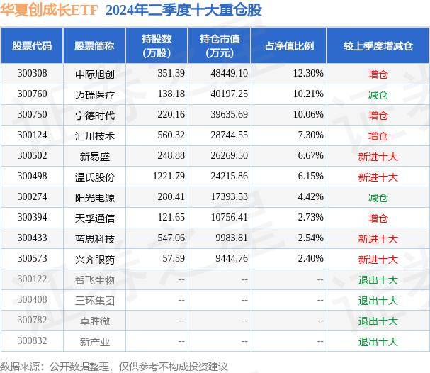 华夏创成长ETF为指数型-股票基金,根据最新一期基金季报显示,该基金资产配置:股票占净值比99.32%,无债券类资产,现金占净值比0.72%。基金十大重仓股如下: