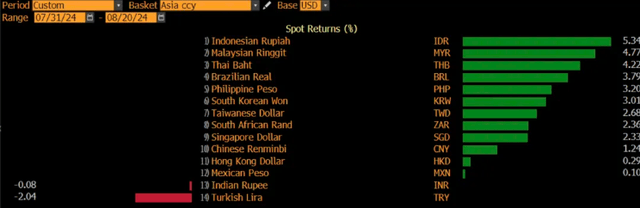 一是利率低,在美联储加息周期中,这些货币被作为Carry trade中的融资货币被借出,今年上半年遭大幅贬值。而且普遍出口企业都有囤积美元的现象,临近美联储降息阶段,这个行为出现了反转,导致这些被低估的货币出现了价值回归。
