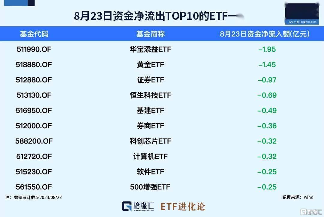 8月23日,ETF资金净流出额TOP10的ETF分别为华宝添益ETF、黄金ETF、证券ETF、恒生科技ETF、基建ETF、券商ETF、科创芯片ETF、计算机ETF、软件ETF、500增强ETF,在8月23日分别获得-1.95亿元、-1.45亿元、-0.97亿元、-0.69亿元、-0.49亿元、-0.36亿元、-0.32亿元、-0.32亿元、-0.25亿元、-0.25亿元的资金净流入。