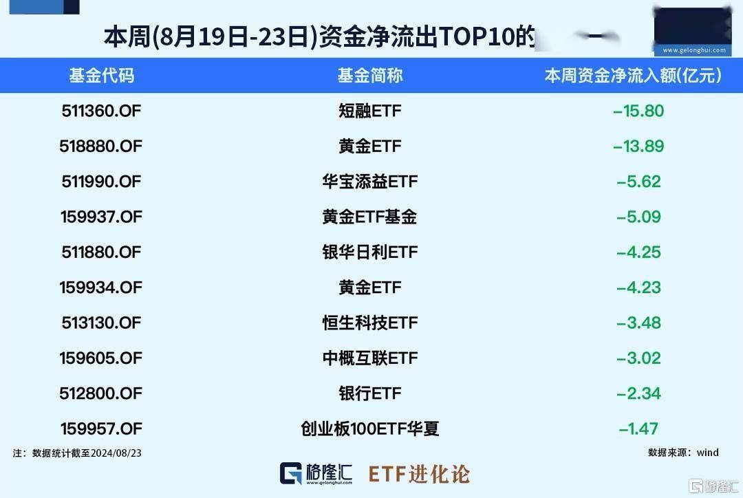 8月19日至8月23日期间,资金净流出额TOP10的ETF分别为短融ETF、黄金ETF、华宝添益ETF、黄金ETF基金、银华日利ETF、黄金ETF、恒生科技ETF、中概互联ETF、银行ETF、创业板100ETF华夏,在本周分别获得-15.80亿元、-13.89亿元、-5.62亿元、-5.09亿元、-4.25亿元、-4.23亿元、-3.48亿元、-3.02亿元、-2.34亿元、-1.47亿元的资金净流入。