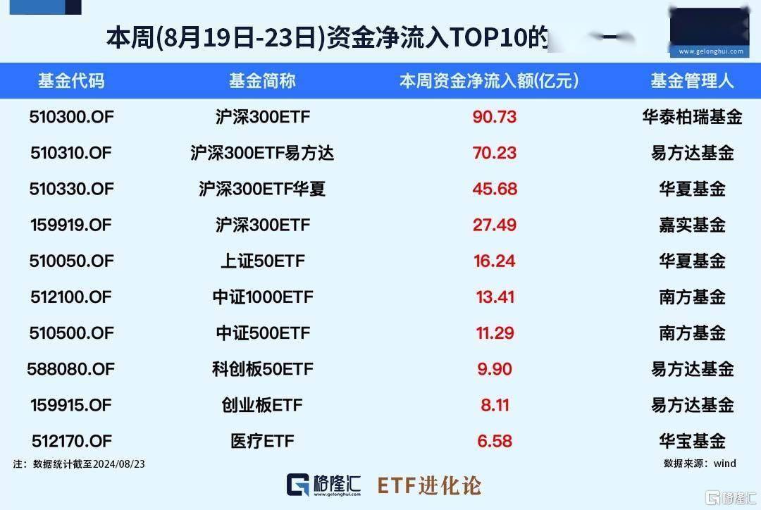 从本周ETF资金流向看,8月19日至8月23日期间,资金净流入额TOP10的ETF分别为华泰柏瑞基金沪深300ETF、沪深300ETF易方达、沪深300ETF华夏、嘉实基金沪深300ETF、华夏基金上证50ETF、南方基金中证1000ETF、南方基金中证500ETF、易方达基金科创板50ETF、易方达基金创业板ETF、华宝基金医疗ETF,在本周分别获得90.73亿元、70.23亿元、45.68亿元、27.49亿元、16.24亿元、13.41亿元、11.29亿元、9.90亿元、8.11亿元、6.58亿元的资金净流入。