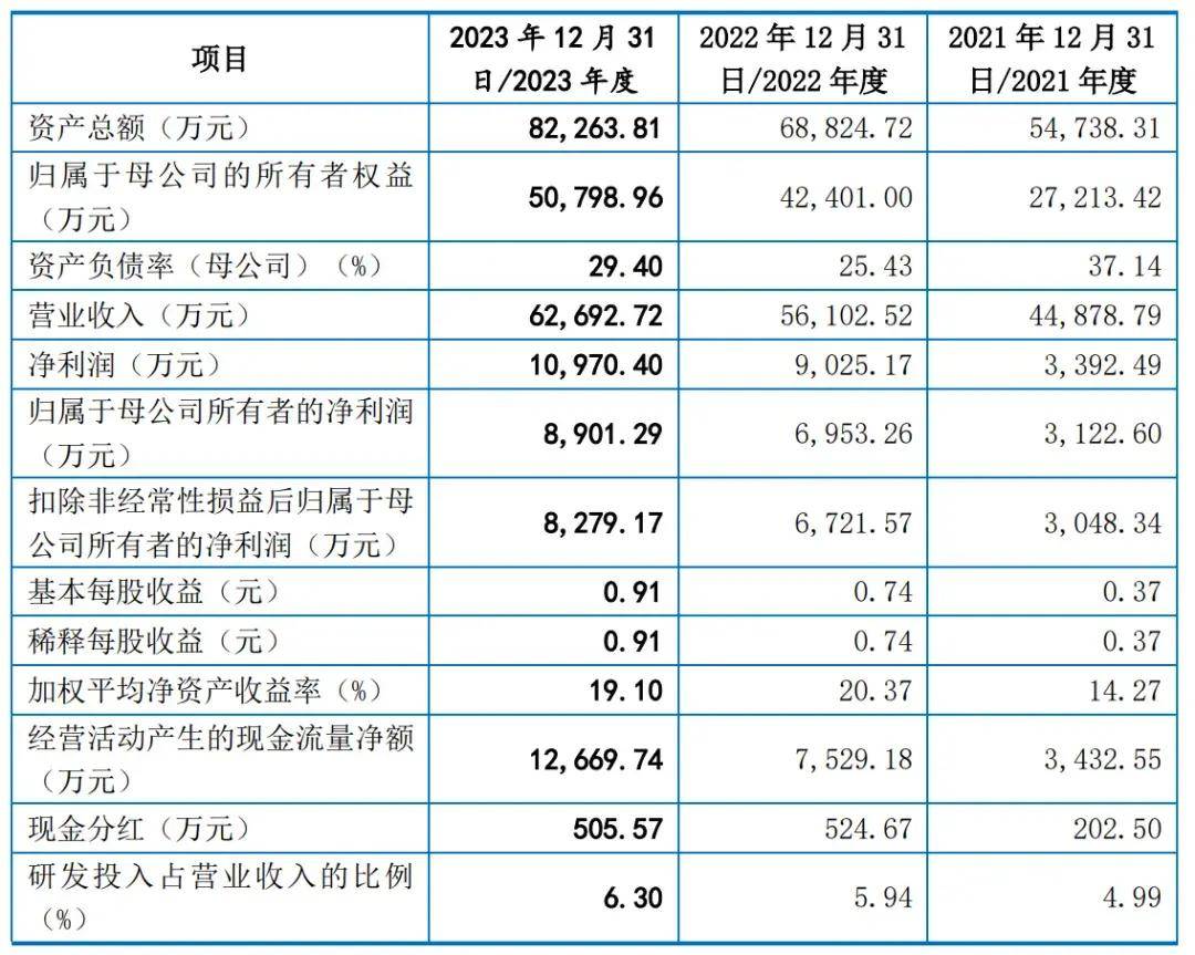 招股书显示,贝特电子2021年、2022年、2023年营收分别为4.49亿元、5.61亿元、6.3亿元;净利分别为3392.49万元、9025万元、1.1亿元;扣非后净利分别为3048万元、6721.57万元、8279万元。