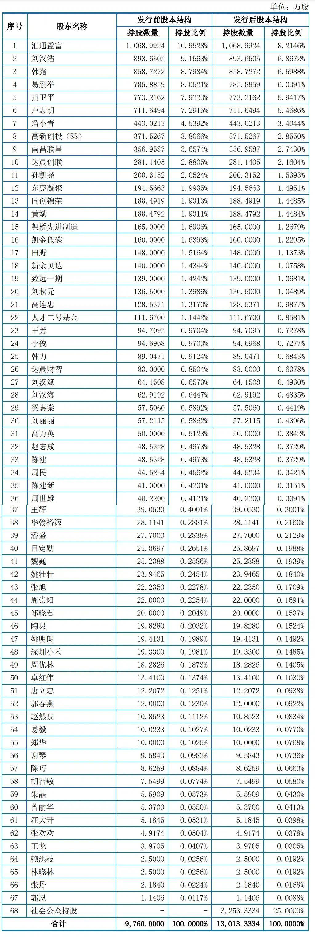 IPO前,汇通盈富持股为10.9528%,刘汉浩持股为9.1563%,韩露持股为8.7984%,易鹏举持股为8.0521%,黄卫平持股为7.9223%,卢志明持股为7.2915%,詹小青持股为4.5392%,高新创投(SS)持股为3.8066%,南昌联昌持股为3.6574%,达晨创联持股为2.8805%;