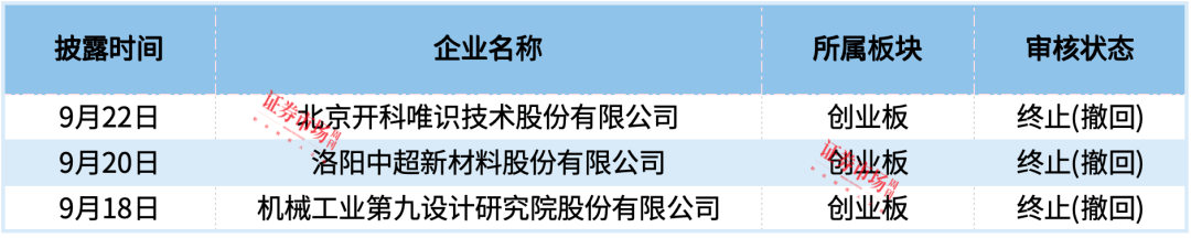 据统计, 9月16日至9月22日,沪深北三大交易所共有家3家企业IPO终止 ,其中包括北京开科唯识技术股份有限公司等,3家终止企业全部集中在创业板。