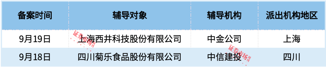 据统计,9月16日至9月22日,新增辅导备案企业2家,分别为四川菊乐食品股份有限公司(以下简称“菊乐股份”)、上海西井科技股份有限公司(以下简称“西井科技”)。