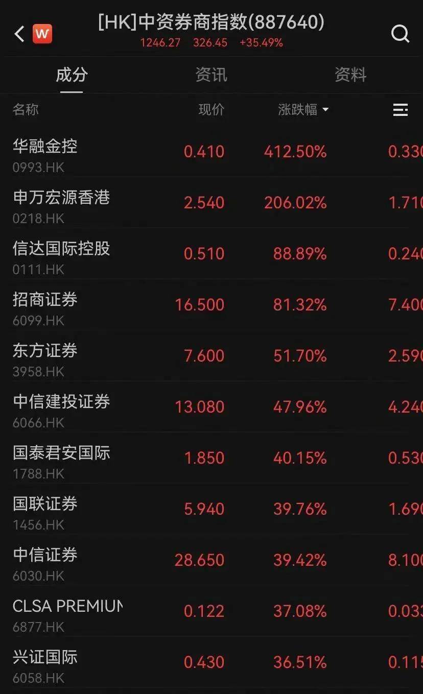 Wind中资券商指数大涨35.49%,创历史新高。华融金控一度飙升超460%,收盘回落至412.5%。招商证券涨超81%,中信证券涨超39%,申万宏源涨超33%。