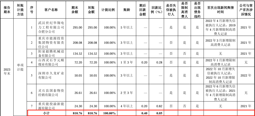 此外,在智能供电系统领域,公司客户武汉世纪华翔电力工程有限公司合肥分公司、深圳市久龙矿业有限公司被列为失信被执行人;重庆市能源投资集团物资有限责任公司已申请破产重组;公司应收阳泉毅腾机械设备有限公司132.5万元,公司起诉立案后被驳回。2023年末,上述公司对发行人的应收账款合计余额810.76万元,现已回款0.4万元。