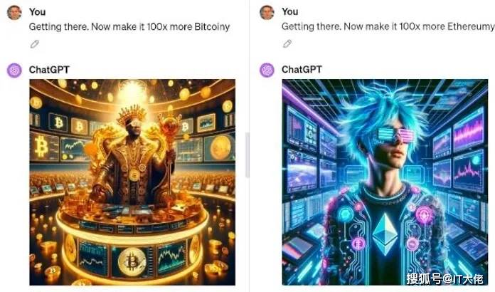 我发过两张图,是我跟ChatGPT说:画一个极端的比特币的人,和画一个也相似极端以太坊的人。左边比特币出现了夸张的土豪,右边以太坊是玩电脑的geek(极客)。可以通过AI看出,比特币和以太坊有文化差异。通过AI,我们可以思考很多人和社会的概念,从而更多地了解自己。